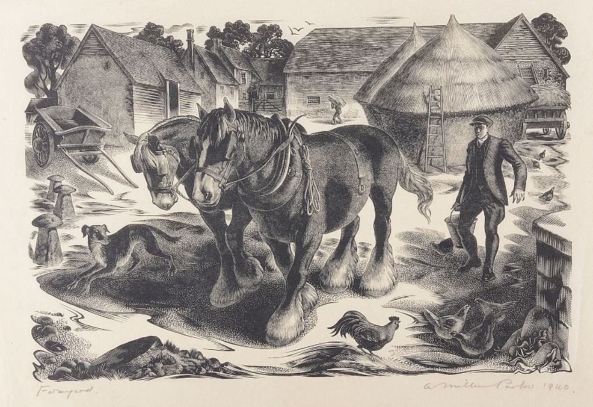 Agnes Miller-Parker (Brit., 1895-1980)'Farmyard' a wood engraving, signed titled and dated 1940 in pencil41.5 x 26.8 cm Condition: Good conditionPlease note this is not a woodcut engraving, we have been advised it is a photographic enlargement of a woodcut for a poster.Collection of Christian Barman (1898-1980) and thence by descent
