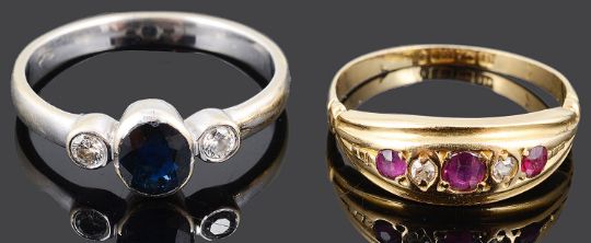 A Continental sapphire and diamond three stone ring and an Edwardian ruby and diamond ringthe former having central oval sapphire flanked by two small diamonds, the white metal mount marked .750 for 18ct white gold, together with an 18ct gold three stone ruby and rose diamond set gypsy ring (2)Condition: sapphire ring wear to mount, gypsy ring overall good, some thinning to shankSapphire ring size 'O', gypsy ring size 'L/M'