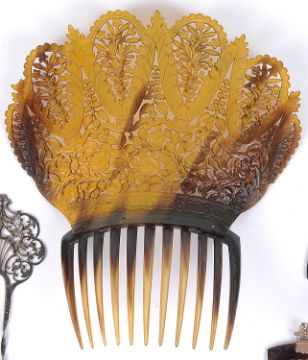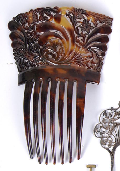 including a large pierced comb heavily carved with roses, garlands and ferns, together with a pierced silver hair pin hallmarked Sheffield 1923 and others (6)