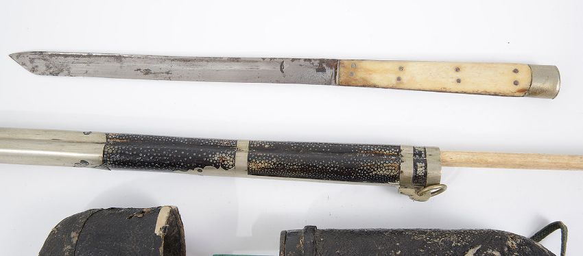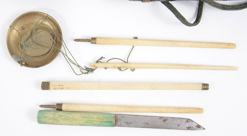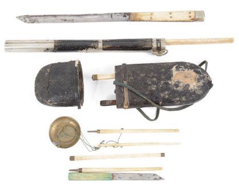 one Japanese having a shagreen case with metal mounts containing a pair of bone chopsticks and a signed steel blade with bone grip handle, the other Chinese in an oval shaped case covered in embossed black paper containing a pair of brass mounted screw fitting two section chopsticks, green stained bone handle knife and pincers, a pair of tweezers and a brass and bone set of opium scales (2)