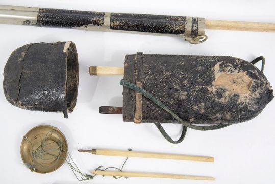 Condition: Shagreen case - some pitting to steel blade, some wear to mounts, oval case - embossed paper covering distressed with areas of loss, old patch repair to one end. steel bladed of knife, tweezers have areas of corrosion, one utensil not present