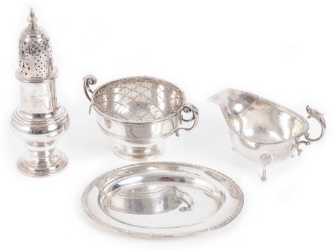 rose bowl - handle to handle 16 cm., gravy boat - stand 17.5 x 14 cm., sugar caster - height approx. 20 cm., weight without plated wire cover, approx. 25.92 ozt.