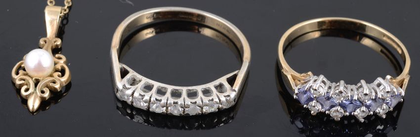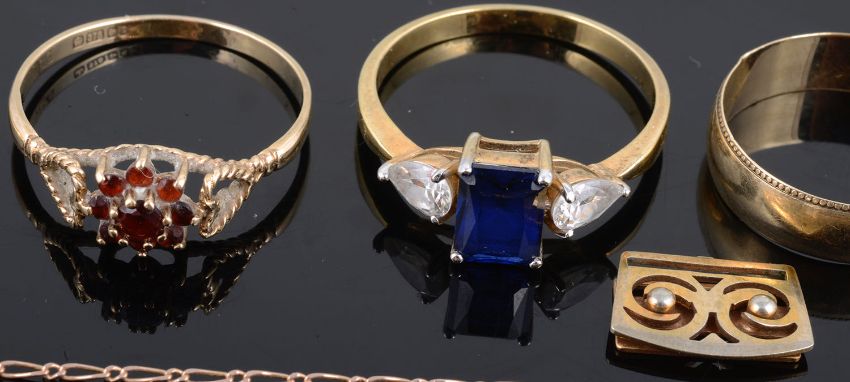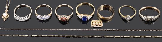 including two small diamond rings a.f., a 9ct gold wedding band, two 9ct gold mounted dress rings, a silver and white sapphire ring and a dress ring (qty)