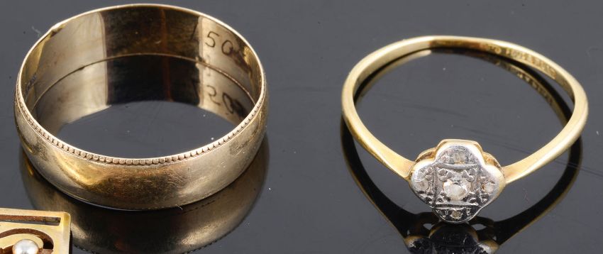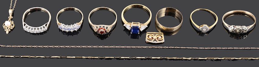 A small collection of gold chains and various gold rings