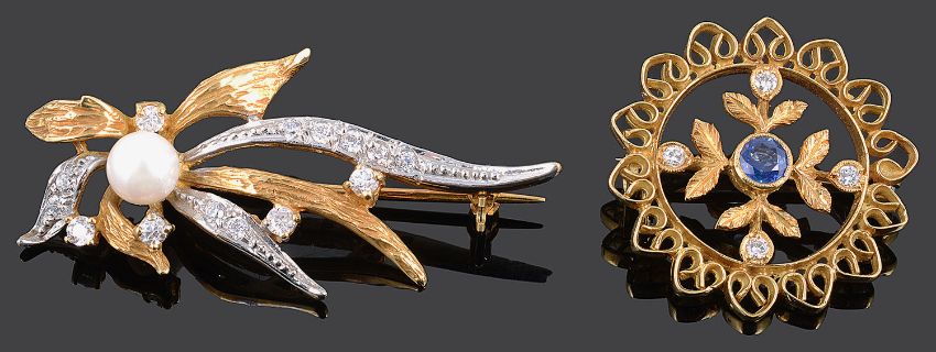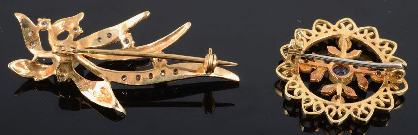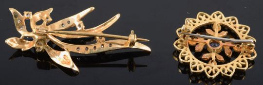 one having central sapphire within a foliate and diamond set circular 18ct gold mount, makers mark N.C., the other formed as a two colour 18ct gold foliate spray having central cultured pearl and diamond set leaves (2)