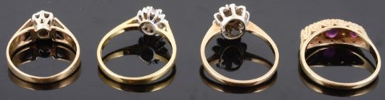 A delicate 18ct. gold sapphire and diamond cluster ring and three other rings