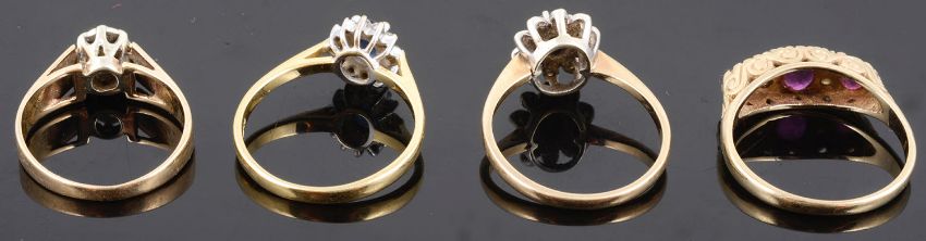 comprising a 9ct gold mounted ruby and diamond gypsy style ring, a 9ct sapphire and diamond cluster ring and a 9ct gold single stone illusion set diamond ring (4)