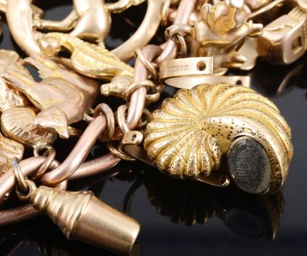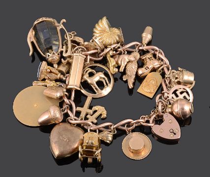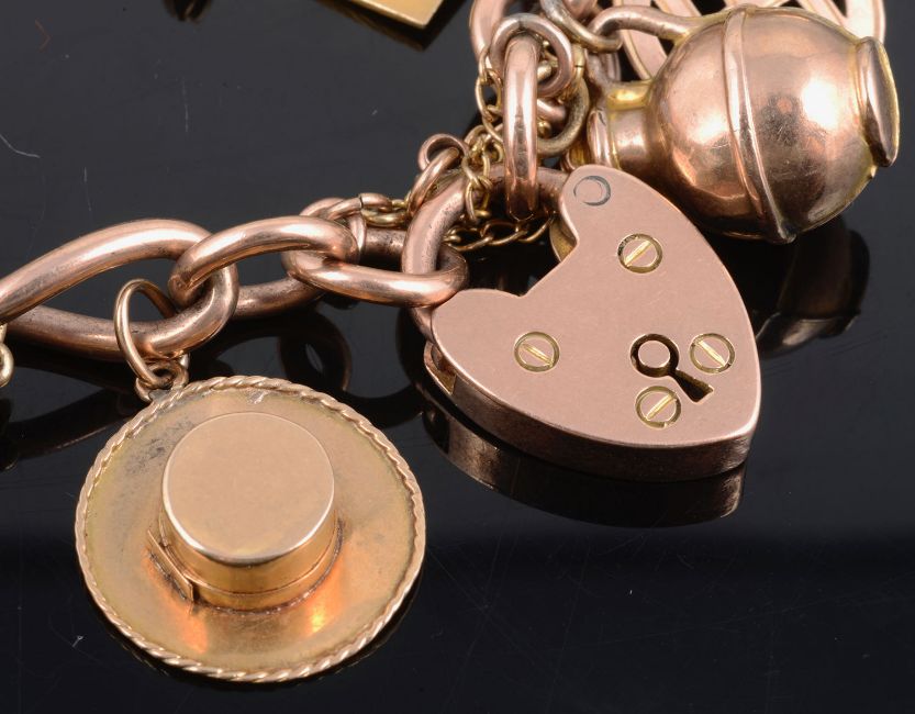 the bracelet of open curb link and suspended with a large variety of mainly 9ct gold charms and pendants including a large quartz set gold coffee pot, woodpecker, two Victorian seals and more, 9ct gold heart padlock fastening