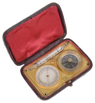 A 19th century brass Fr. pocket barometer, thermometer and compass travelling compendium