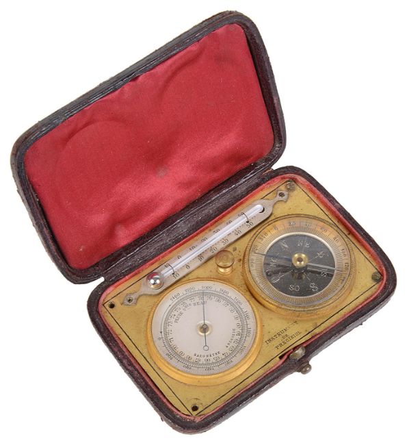 Condition: Two screws missing to one side of the brass plate holding the instruments to the leather case. One screw missing holding the thermometer to brass plate. Leather case with some scuffing commensurate with age and use. one corner slightly more worn than others.