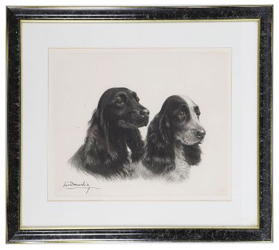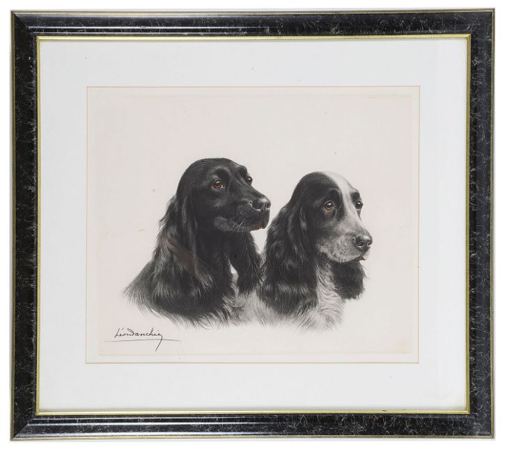 'A study of two cocker spaniels', a hand coloured etching, signed mounted framed
