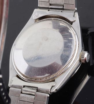 the silver dial with stainless steel hour baton markers and hands, signed Rolex, automatic movement, stainless steel expandable tapering bracelet, fold over clasp, numbered 6635, in original box and accompanied by original receipt dated 20 May, 1970