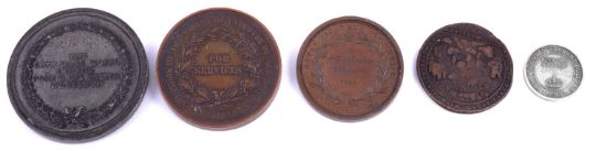 comprising Admiral Vernon and the Capture of Portobello pinchbeck medal, 1739, obv. half length portrait of Vernon, legend The.Brit..Glory.Reviv'd.by.Admiral.Verno, rev. fleet in the harbour, together with H.R.H Prince Albert, The Great Exhibition, London, 1851, Presentation Copper Medal. “For Services”, by William Wyon, obv. head of Prince Albert left, named on edge, 'T. Knowlson', a Royal Academy of Music copper prize medal, a Viscount Dudley and Ward Baron of Birmingham The rich mans model and the poor mans friend, 1807 medal and a Victorian diamond jubilee silver medalet, 1897 (5)