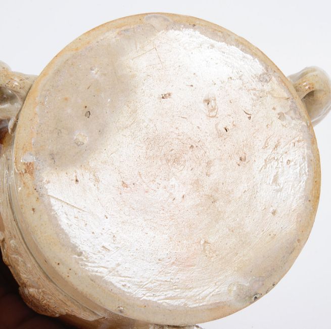 the handles moulded as greyhounds, the body with applied relief moulded decoration depicting a beer drinker and pipe smoker, both in 18th century dress and St George slaying the dragon