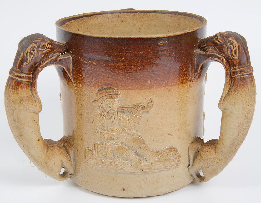 An early 19th Century Derbyshire salt glazed stoneware tyg