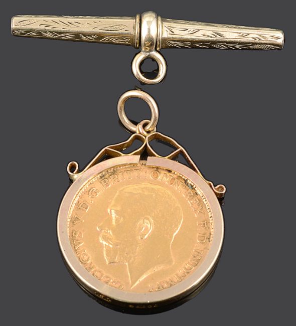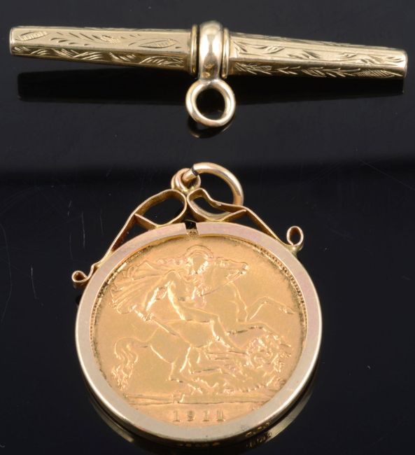 gold coin 0.916, Obverse: uncrowned head of King left, GEORGIUS V D.G.BRITT:OMN:REX F.D.IND:IMP:, Reverse St George slaying the dragon, together with a late Victorian gold plated faceted and foliate engraved T bar fob (2)