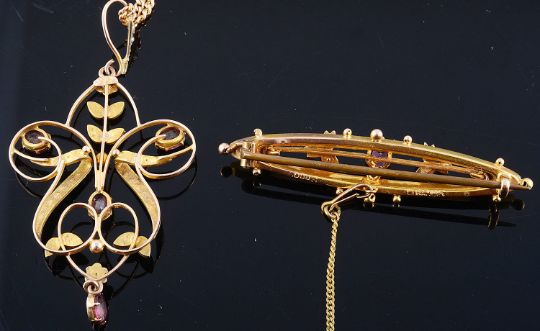 the pendant marked 9ct to reverse and suspended from a rose coloured chain, tests for gold, together with an Edwardian amethyst and seed pearl brooch, marked for 9ct to reverse, associated Toye & Co. box (2)