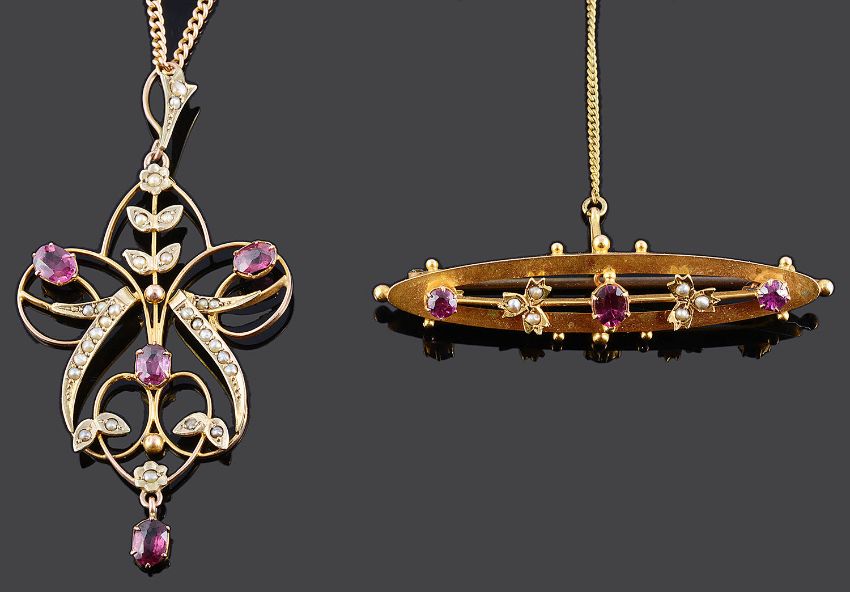 An Art Nouveau garnet and seed pearl scroll pendant and brooch