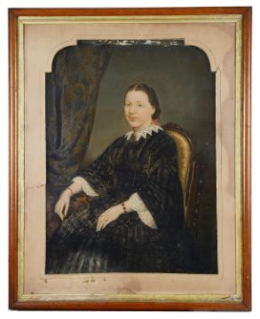 'Portrait of a seated woman wearing a black tartan dress with lace collar and cuffs', oil on card, unsigned mounted, framed