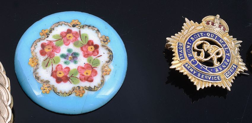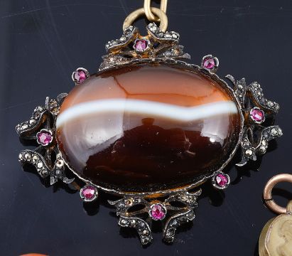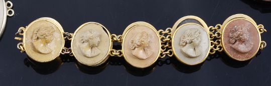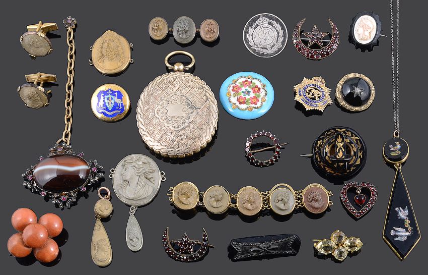 comprising a Victorian lava cameo bracelet, triple brooch adapted cufflinks and three other lava cameo pieces, a Victorian micro mosaic set pendant converted from an earring, four various garnet set brooches, unusual agate garnet and marcasite set pendant fob ? (altered), a 9ct gold and enamel sweetheart pin and a silver pin (both a.f.), a five stone operculum set brooch, pin a.f., a small four stone citrine brooch, large early Victorian gold clad hinged portrait locket, silver gilt 'Australia" enamelled crest pin and several other related items (qty)