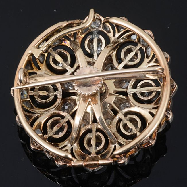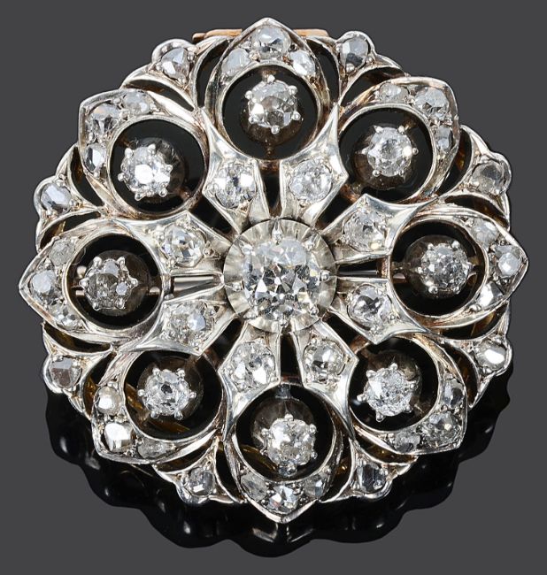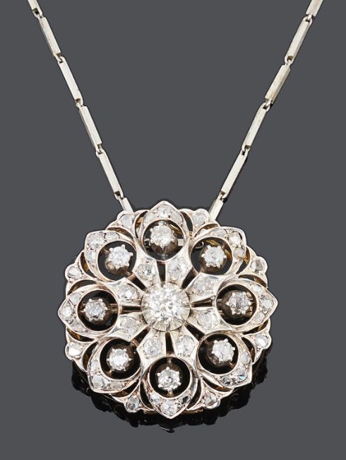 the circular brooch of circular floral cluster form with pierced detail and set with central collet set diamond within a detailed fancy cluster design, removable original brooch fitting, tests for gold, suspended from a later silver bar link chain