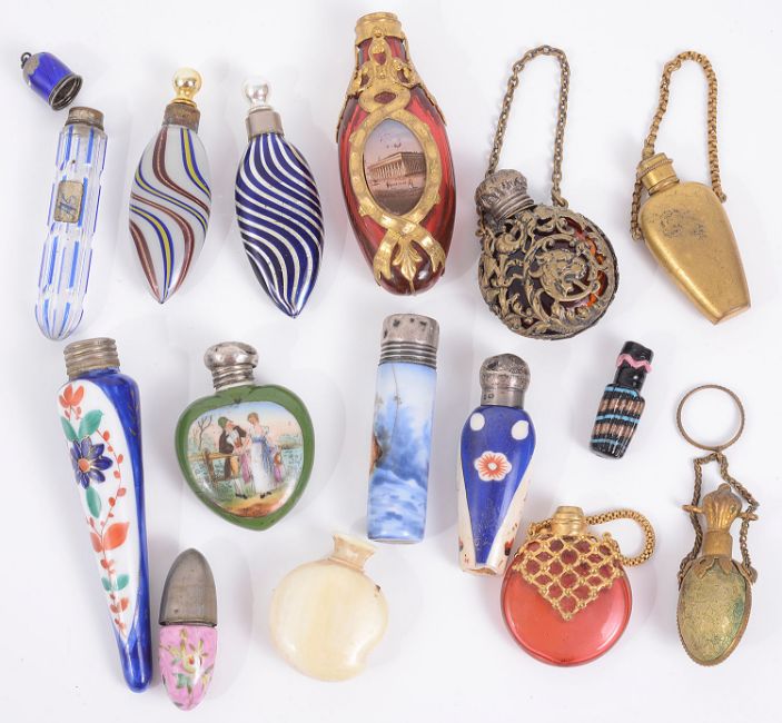 Condition: Palais royal scent bottle, stopper absent, ivory scent bottle, stopper absent, blue flash phial with loss to enamel, heart shaped bottle, silver mount compressed and pushed with dings, Lutz example with corrosion to mount. Others, one is damaged and a/f, porcelain tapering example is lacking screw on top and three have no stoppers