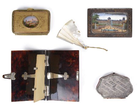 the purse of cartouche form, engraved with wrigglework design having a rope twist border, unmarked, red morocco and pink silk interior, a 19th century tortoiseshell aide memoire folder, hinged with ivory page and metal clips, having clasp fastener, a Victorian gilt metal foliate embossed purse inset with a reverse glass view of Osborne House, a Fr. Palais Royal mount inset with a watercolour on ivory view of the Tuileries Palace, within a damascened cut steel border and a mother of pearl and ivory aide memoire in the form of a fan (5)