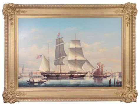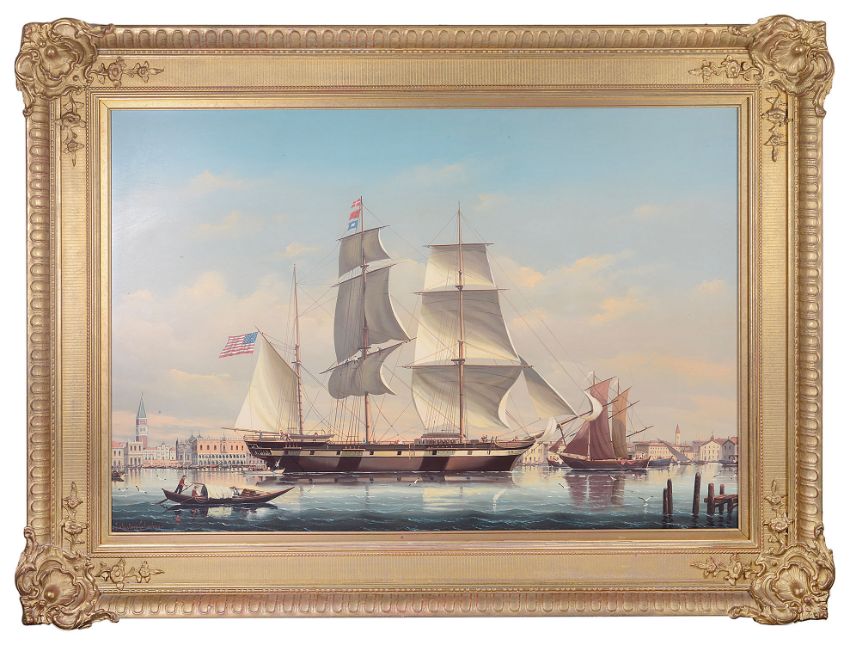 'An America man o' war Peeress in sail in the Venice lagoon', the Doge's palace and St Marks Square in the distance, oil on board, signed, gilt frame