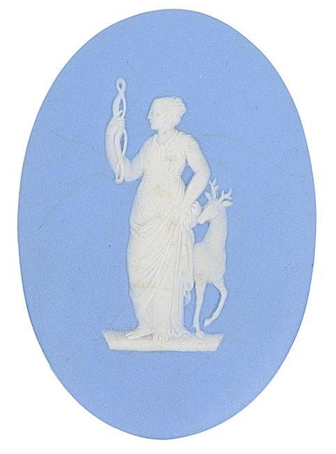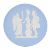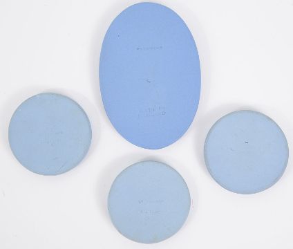 comprising one larger darker blue oval example and three round, each moulded with typical classical subject matter, impressed marks (4)