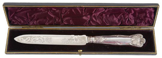 having serrated blade engraved to one side with foliate design and a filled silver handle with shell terminal, in original fitted case