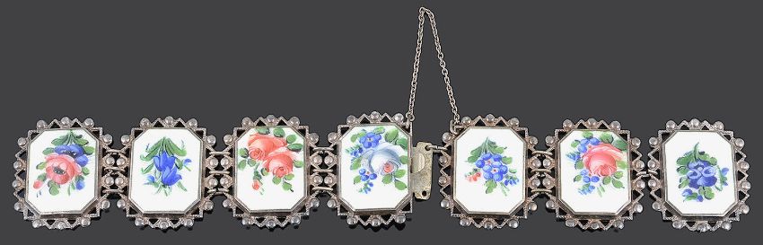 the octagonal panels with pierced and beaded borders, decorated with guilloche enamel white ground and enamel pansies, roses, forget-me-nots, peonies, the reverse with stamped initials AND and stamped 925, with safety chain, boxed