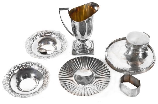 of usual plain form, loaded, together with a a pair of Indian pin dishes with foliate pierced and engraved rims, marked Mappin & Webb silver, a contemporary helmet shaped cream jug with gilt interior, Sheffield, 1971 by James Dixon & Sons, a modern design circular footed fluted dish, Sheffield, 1972 by James Dixon & Sons, an octagonal napkin ring and a silver salt spoon (7)