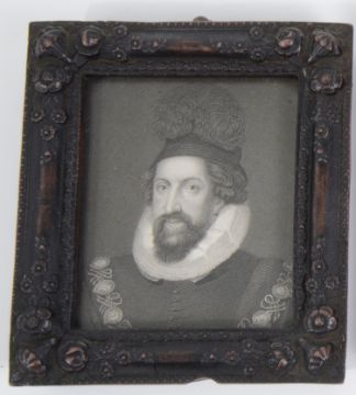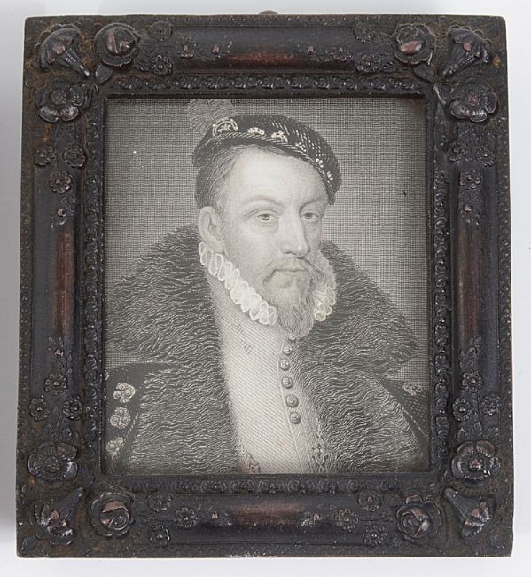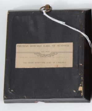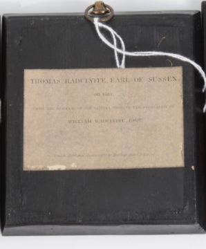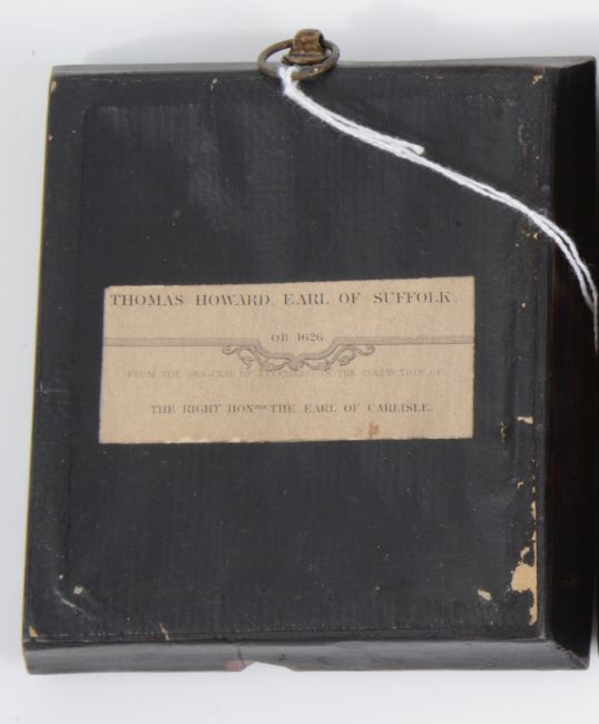portrait miniature of woman in regency dress, watercolour on ivory, oval, period rectangular black lacquer frame, together with two engraved portraits, Thomas Howard, Earl of Suffolk after Zucchero and and Thomas Radclyffe, Earl of Sussex aft Sir Antonio More, published London, 1823 by Harding, Maver & Lepard, ebonised foliate moulded frames (3)