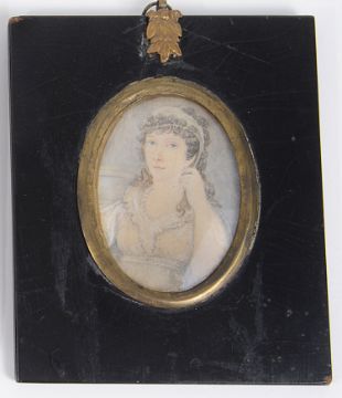 portrait miniature of woman - aperture 7 x 5 cm., overall 10.3 x 12.7, engraved portraits - overall 11 x 12 cm.