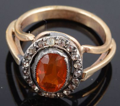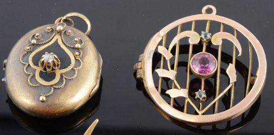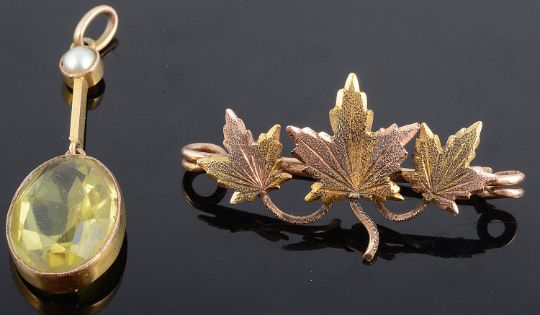 the brooch marked 15ct to reverse, together with a pair of yellow metal and cultured pearl foliate drop earrings, screw post fittings, a small triple maple leaf brooch, tests for gold, a rose diamond set hinged locket, a gold mounted cluster dress ring, an amethyst set Edwardian brooch a.f., and a drop pendant, both items test for gold (qty)