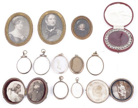 gilt metal frame the surround with black dot paste and suspension ring, in original red grained morocco case, together with an oval portrait miniature painted on card of young boy in a glazed giltwood frame, written in ink obverse "Laughing Boy from Shelley, copied by me S. Malden. 1788.", eight Georgian and later oval glazed gilt metal portrait miniature locket frames, some hinged, two leather portrait miniature cases and a pair of early 19th century oval stipple engravings of an officer and lady in gilt metal frames, (qty)