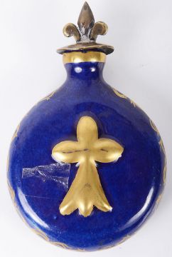 mottled blue glaze, moulded with a gilt fleur-de-lys obverse, reverse a cross, gilt rim and scrolls to sides, brass fleur-de-lys stopper
