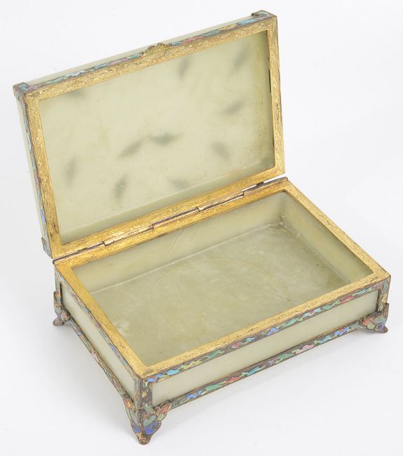 of rectangular form, the silver gilt frame decorated in brightly coloured enamel with flowers, inset with celadon jadeite panels, the hinged lid decorated with applied green hardstone leaves, raised on shaped bracket feet
