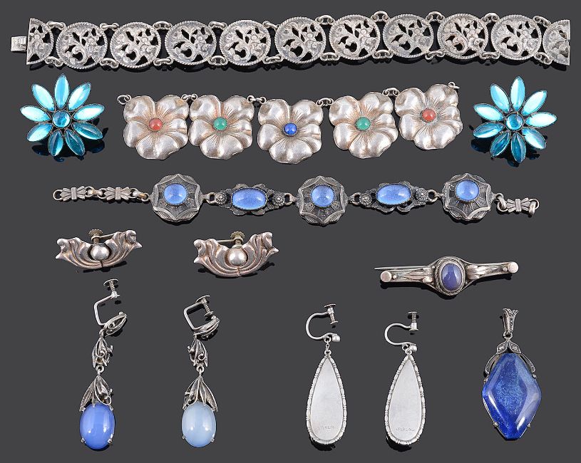 including a white metal part Coro 'pansy' necklace, a pair of harlequin dyed chalcedony Arts & Crafts floral ear drops, butterfly wing drop earrings, Taxco earrings and more (qty)