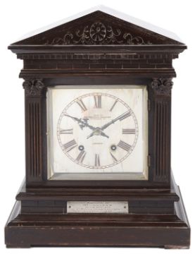 the ebonised case with triangular pediment over a glazed door flanked by pair of engaged Corinthian pilasters, on a stepped plinth base, the square silvered dial with Roman numerals and minute track signed exam'd by Goldsmith's Company 112 regent St, London, 8 day German brass quarter striking movement signed W & H sch, winding key. bears presentation plaque to base "Presented to the Mr Jefford by the Officers 5th Royal Irish Lancers Muttra 1897"