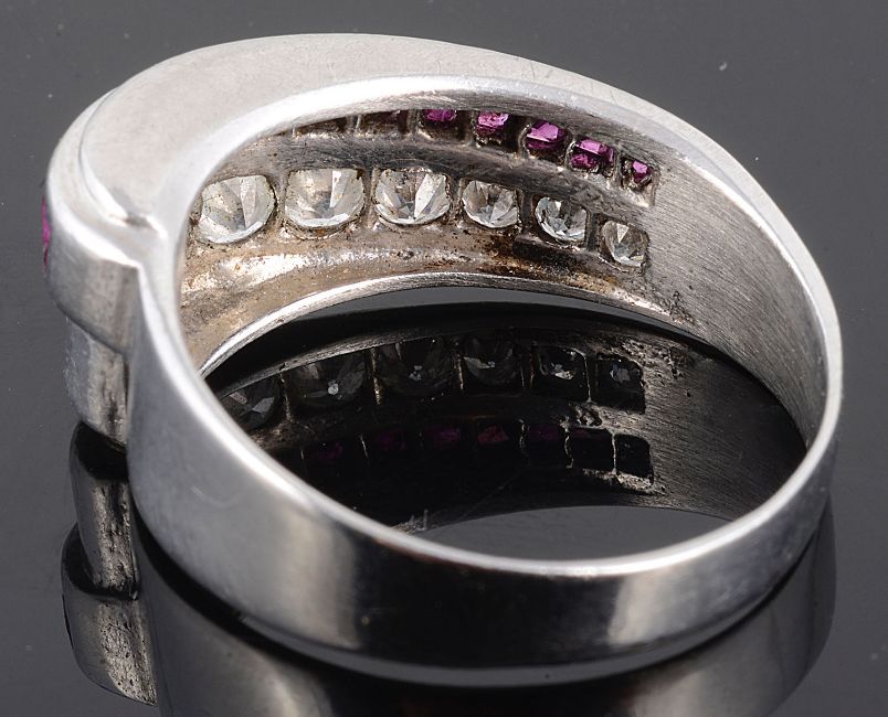 the platinum mount of domed design and set with a graduated row of diamonds and a row of small channel set square cut rubies