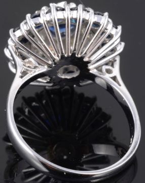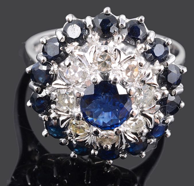 having central blue sapphire, untested, within a border of white sapphires and a further blue sapphire border, white metal mount stamped 18ct