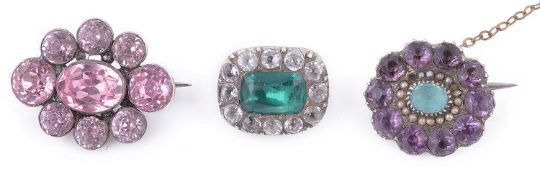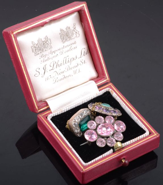 the former white metal mount and set with two colour pink pastes, together with an amethyst and emerald paste cluster brooch and a small green and white paste cluster brooch, test a mixture of gold and silver, associated leather box S. J. Phillips of New Bond Street (3)