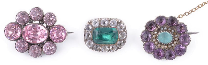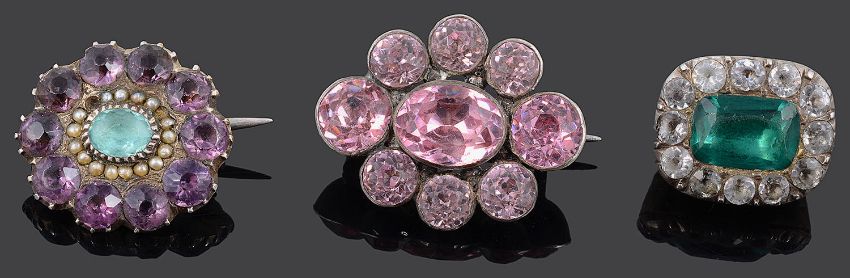 Condition: Pink paste overall good, wear commensurate with age for all three, scuffing to larger green paste, two seed pearls absent from amethyst paste cluster