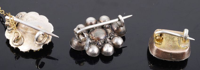 A small Georgian pink paste brooch and two other small Georgian brooches