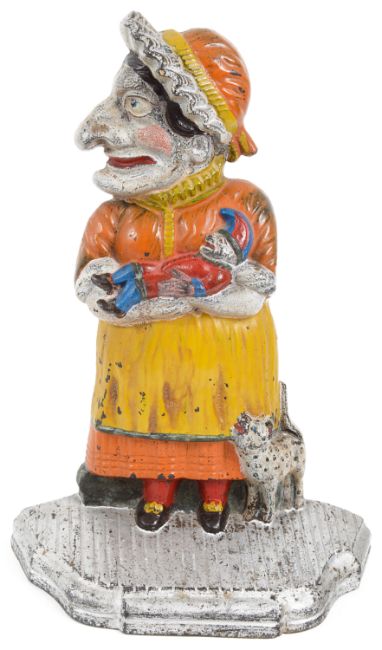 A Victorian Mrs Punch and Baby painted cast iron doorstop