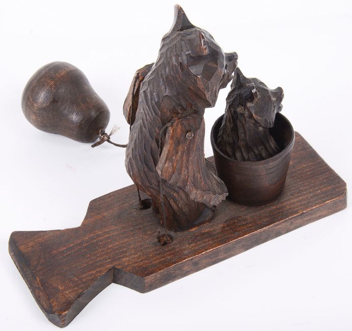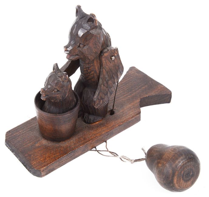 A contemporary Russian motion toy carved as bear washing a cub in a bath tub