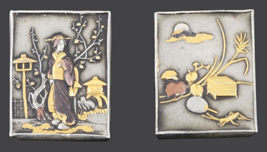 of rectangular form, one with a relief image of a geisha girl amongst a blossoming tree and the other depicting a fan, locust and a basket, both with impressed mark to reverse