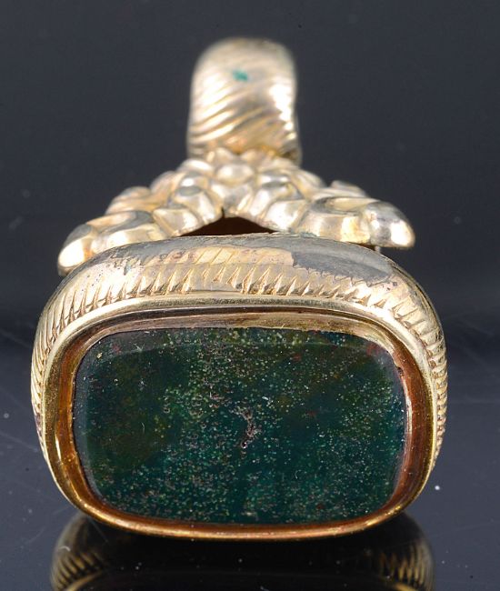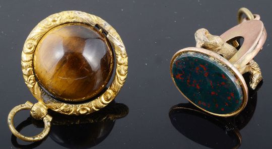 including a bloodstone set horse and horseshoe seal fob, a Georgian paste and hardstone set pendant watch key and three other watch keys, one gold clad, a small Stanhope seal, a.f, together with four other items (10)