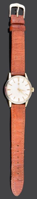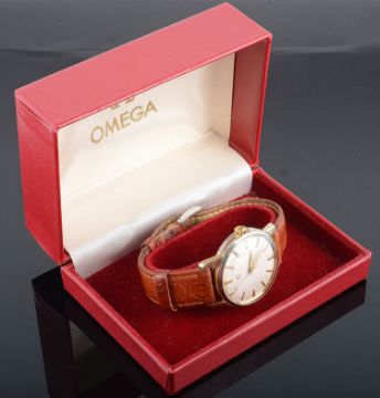 circular silvered dial having gold baton markers, pierced gold hand and sweep seconds hand, leather bracelet with buckle fastener, Omega box
